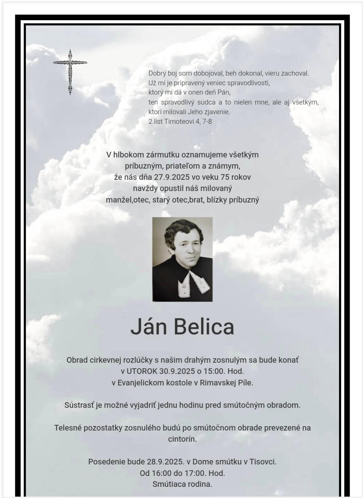 Oznamujeme evanjelickej verejnosti, že v sobotu, 27.9.2025 zomrel vo veku 75 rokov, brat diakon Ján Belica.