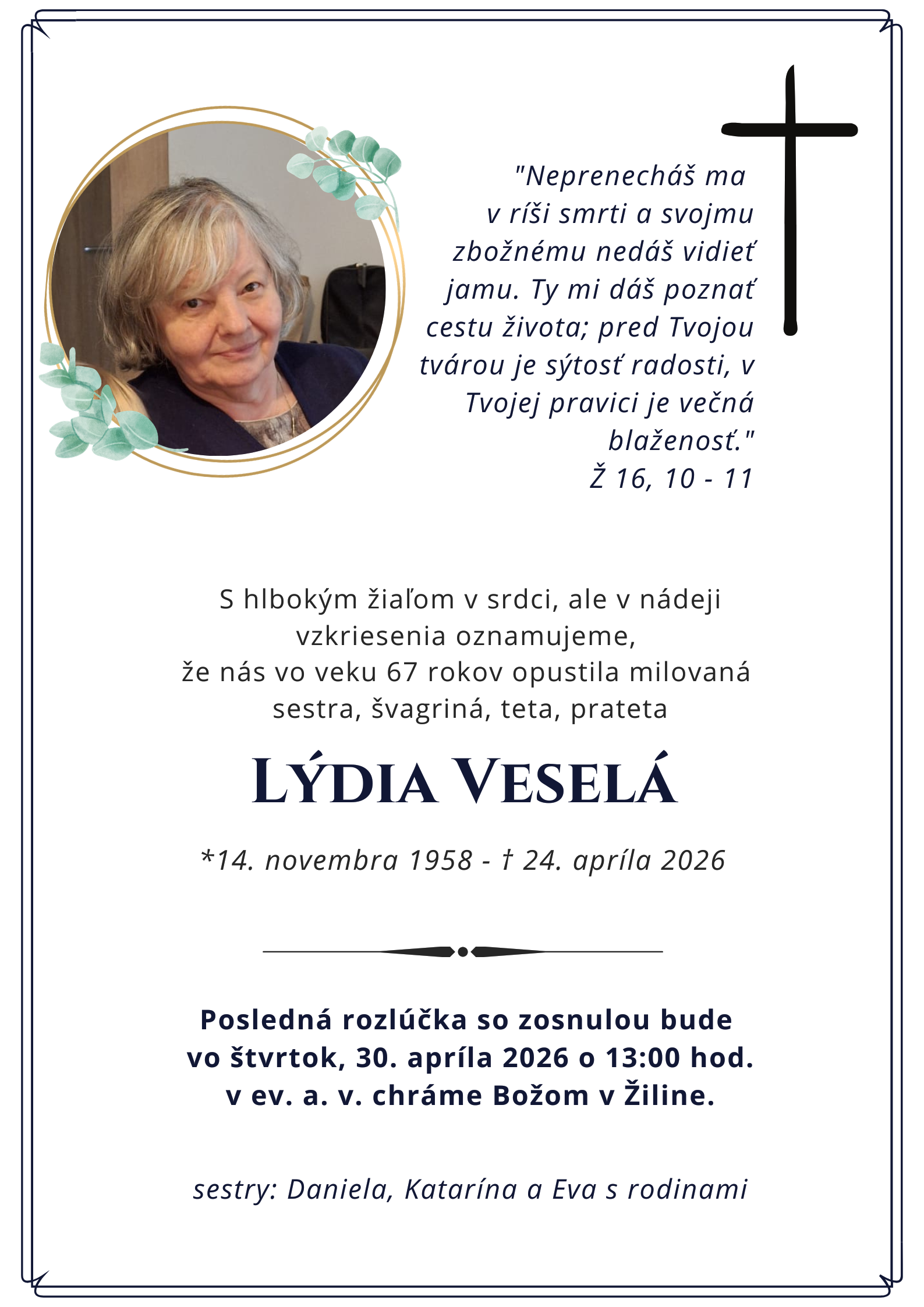 Posledná rozlúčka s drahou zosnulou bude vo štvrtok, 30. apríla 2026 v Ev. a. v. chráme Božom v Žiline.