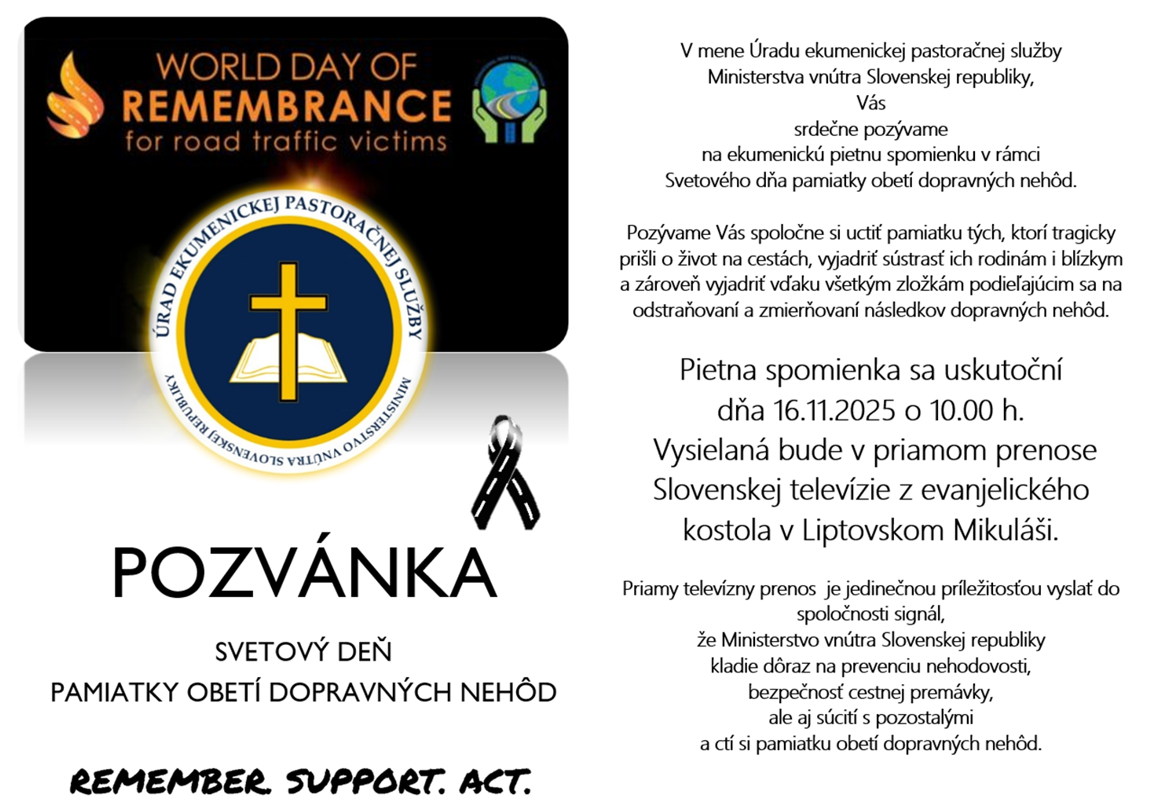 Aj tento rok pozýva Úrad ekumenickej pastoračnej služby Ministerstva vnútra Slovenskej republiky CZ ECAV v 3. novembrovú nedeľu - 16.11.2025 v rámci svetového dňa pamiatky obetí dopravných nehôd, pripojiť sa v rámci pietnej spomienky k modlitbám za rodiny, ktoré sú dotknuté nešťastím na cestách.
