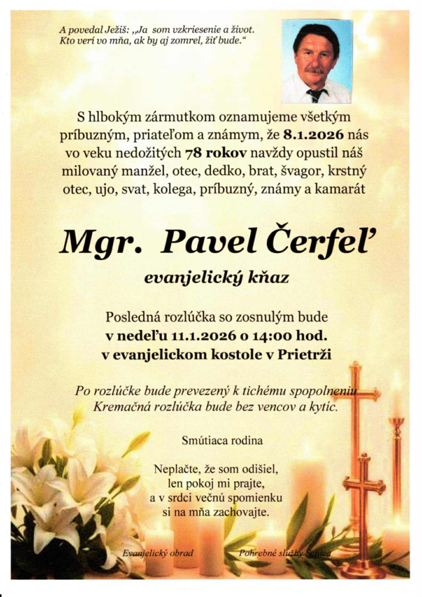 Dozvedeli sme sa smutnú správu: v požehnanom veku 78 rokov zomrel brat farár Pavel Čerfeľ, ktorého si Pán povolal 8. januára 2026. Pohreb zosnulého bude v Evanjelickom kostole v Prietrži, dňa 11. januára 2026 o 14.00 hod.