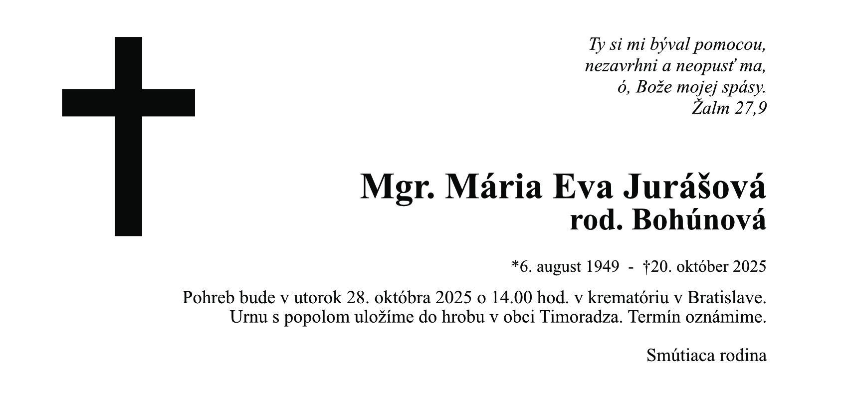 S hlbokým zármutkom, ale v pevnej nádeji vzkriesenia a večného života oznamujeme evanjelickej verejnosti, že Pán života a smrti povolal 20.10.2025 z tejto časnosti našu drahú sestru Máriu Evu jurášovú, rod. Bohnovú, vo veku 76 rokov.