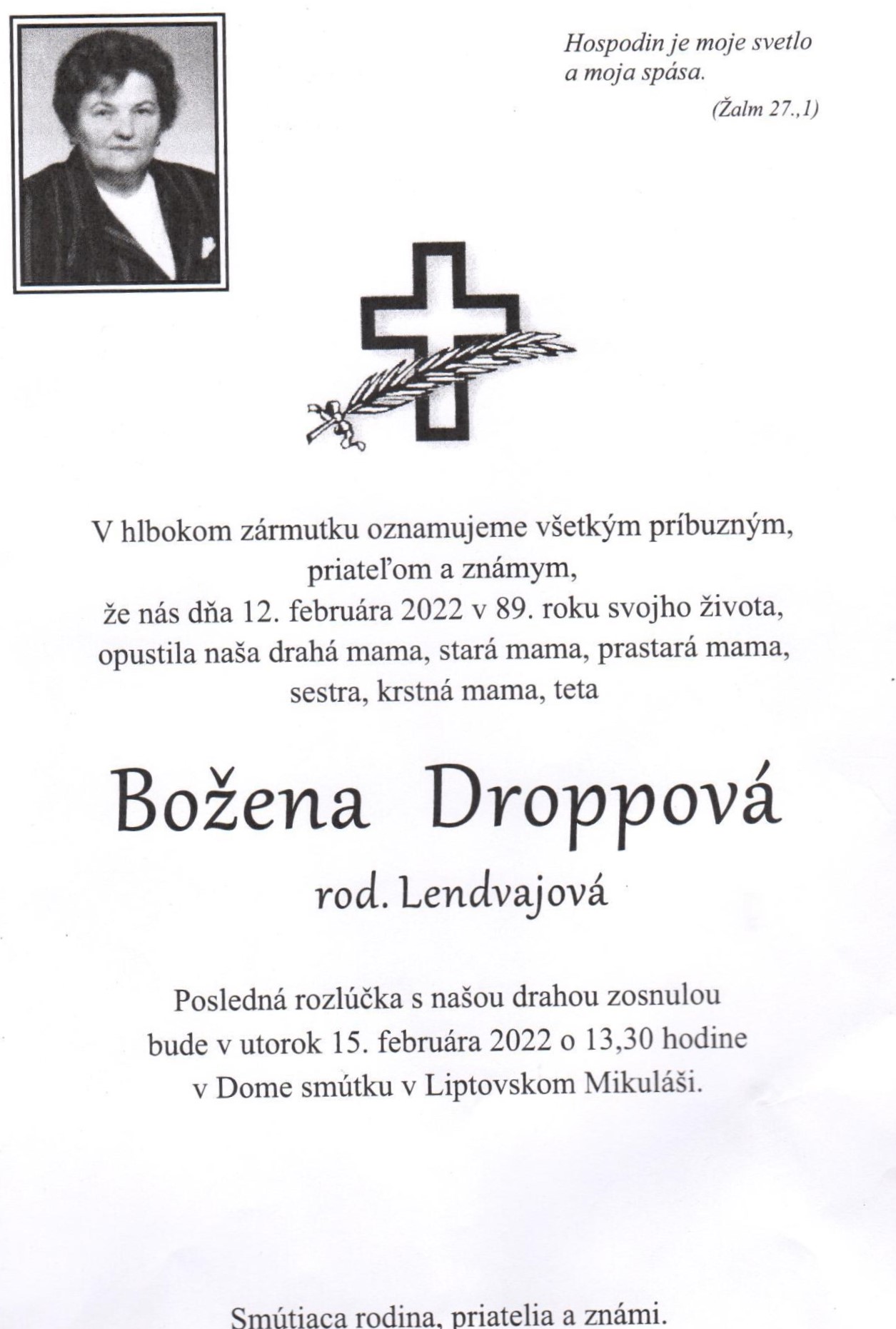 Cirkevný zbor Liptovský Mikuláš a Liptovsko-oravský seniorát ECAV na Slovensku sa dňa 15. 2. 2022 rozlúčili so zosnulou sestrou Boženou Droppovou. rodenou Lendvajovou, manželkou po zosnulom bratovi farárovi Vladimírovi Droppovi.