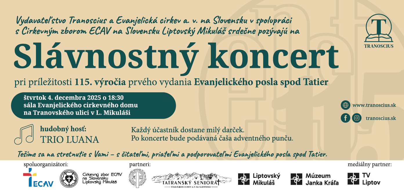 Vystúpi inštrumentálne TRIO LUANA, ktoré svojím hudobným prejavom prinesie atmosféru pokoja a nádeje – presne takú, akú chceme ako vydavateľ aj naďalej niesť.