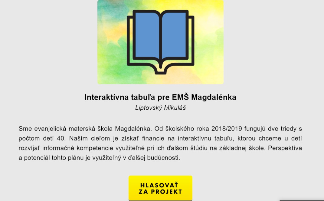 Evanjelická materská škola Magdalénka, ktorej zriaďovateľom je Liptovsko-Oravský seniorát, sa snaží získať financie na interaktívnu tabuľu, ktorou chcú u detí rozvíjať informačné kompetencie využiteľné pri ich ďalšom štúdiu na základnej škole. Dajme im svoj hlas :)