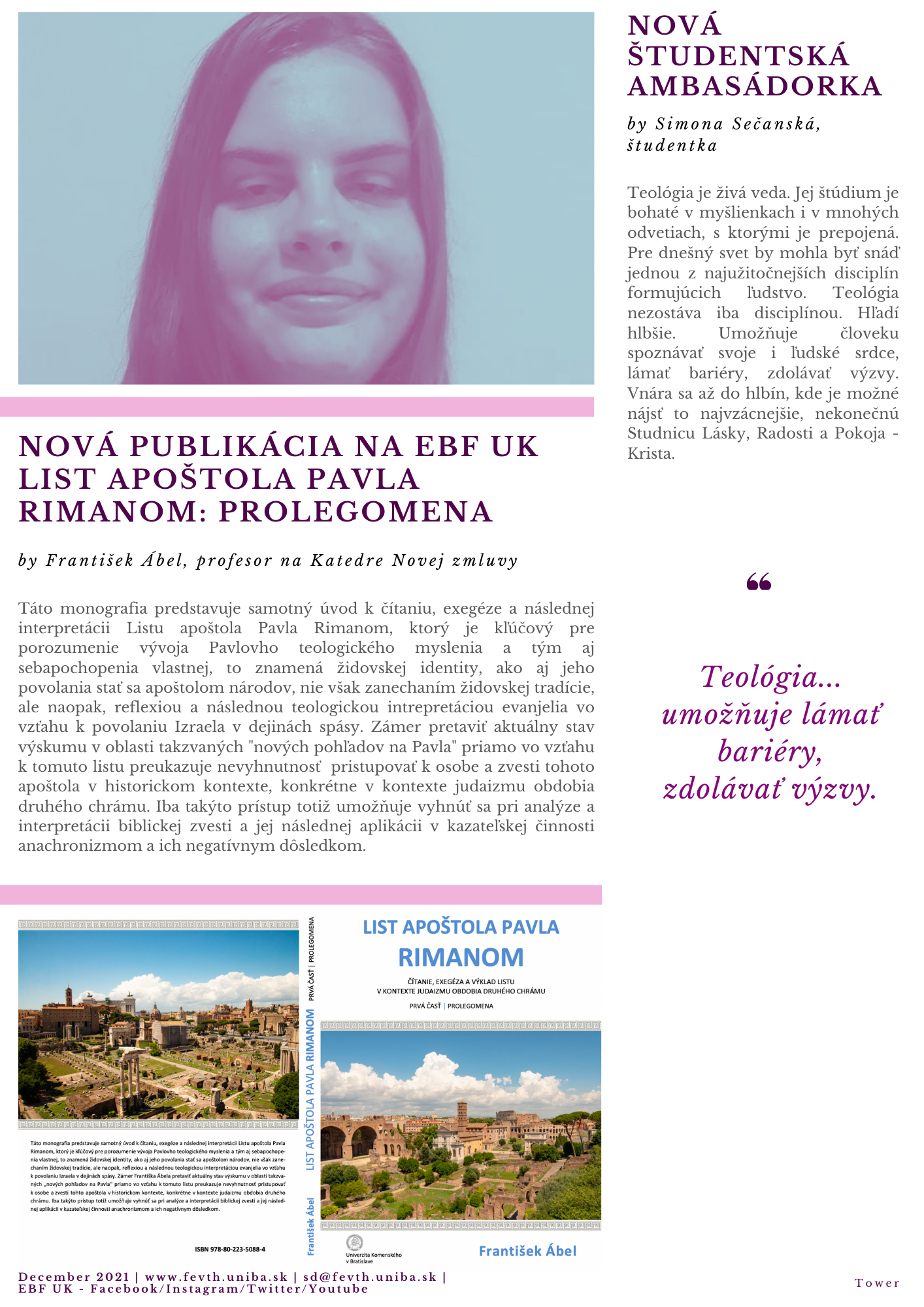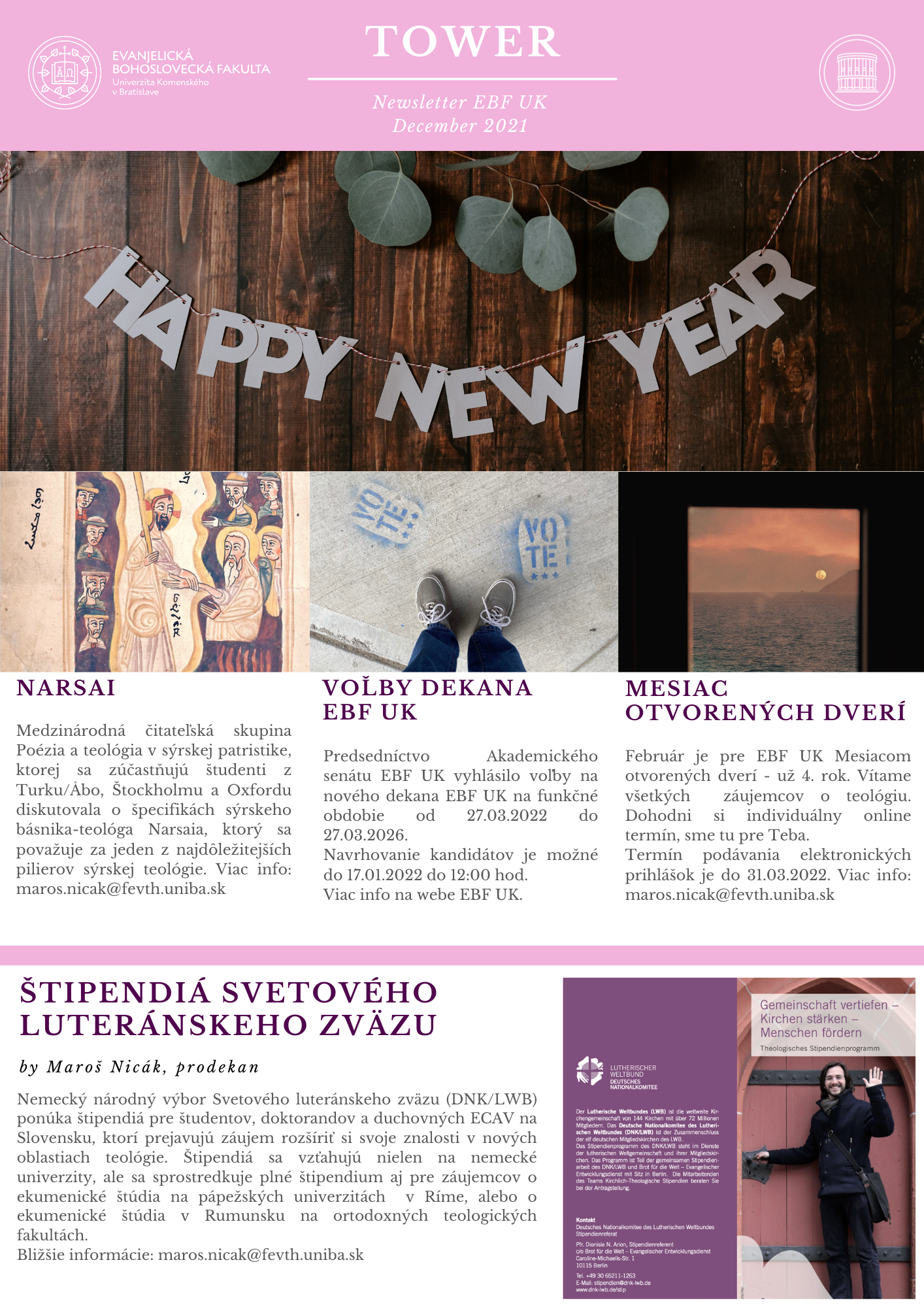 V priloženom čísle sa dočítate o novej monografii týkajúcej sa Listu apoštola Pavla Rimanom, štipendiách Nemeckého národného výboru Svetového luteránskeho zväzu, ktoré sú určené študentom, doktorandom a duchovným, ďalej o vyhlásených voľbách dekana EBF UK a blížiacom sa Mesiaci otvorených dverí na EBF UK. Už 4. rok v poradí prezentujeme uchádzačom štúdium na EBF UK aj online.