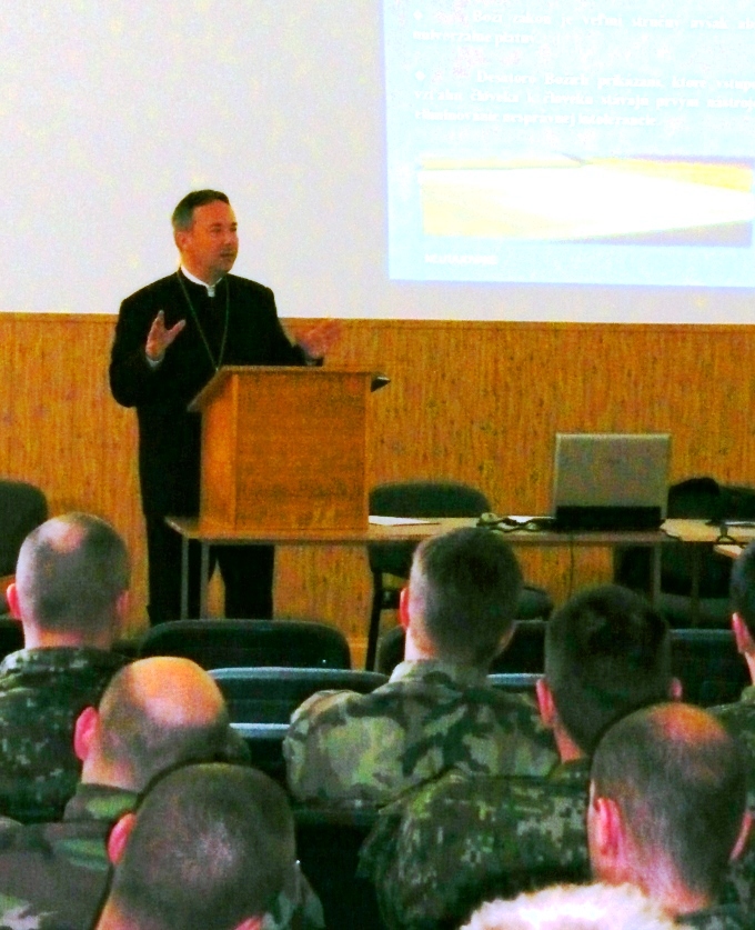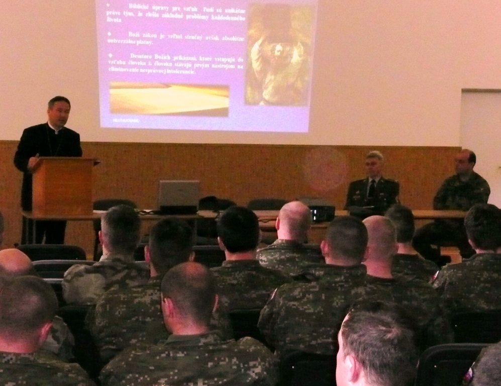 Generálneho biskupa prijal zástupca veliteľa pplk. Ing. Milan Salaj, ktorý ho v prezentácii oboznámil s poslaním a úlohami 5. PSU. Po predstavení generálny biskup v zaplnenej kinosále v prednáške rozobral rozličné formy intolerancie medzi ľuďmi. Intolerancia má mnohoraké podoby, napr. prejavuje sa v rasovej, náboženskej alebo národnej neznášanlivosti a nepriateľstve voči cudzincom.