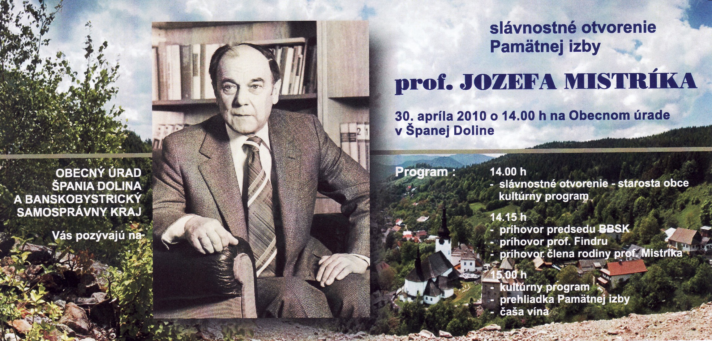 Otvorenie Pamätnej izby prof. Jozefa Mistríka sa uskutoční 30. apríla 2010 o 14.00 hod. na Obecnom úrade v Španej doline.