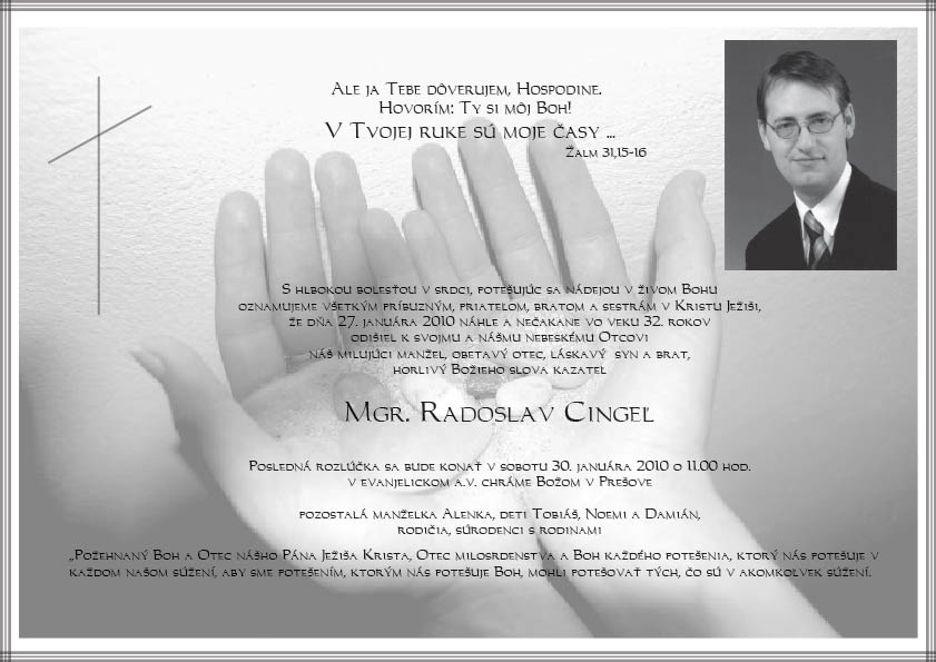 s hlbokou bolesťou v srdci, potešujúc sa nádejou v živom Bohu, oznamujeme všetkým príbuzným, priateľom, bratom a sestrám v Kristovi Ježišovi, že dňa 27. januára 2010 náhle a nečakane vo veku 32 rokov odišiel k svojmu a nášmu nebeskému Otcovi milujúci manžel, obetavý otec, láskavý syn a brat, horlivý Božieho slova kazateľ Radoslav Cingeľ.