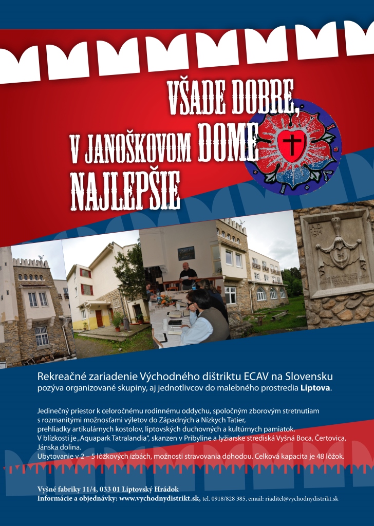 Biskupský úrad VD ECAV ponúka možnosť ubytovania pre cirkevné i školské výlety, tábory, rodinné dovolenky, pracovné školenia a kurzy v rekreačnom zariadení Janoškov dom neďaleko Liptovského Hrádku.