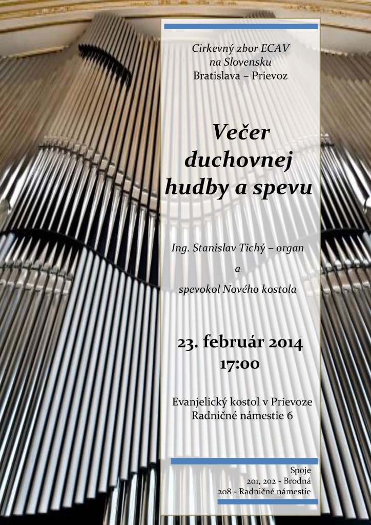 CZ ECAV Bratislava-Prievoz vás pozýva na večer duchovnej hudby a spevu, ktorý sa uskutoční v nedeľu 23. februára 2014 o 17.00 hod. v Ev. a. v. kostole na Radničnom nám. 2. Program: Stanislav Tichý (organ) a spevokol Nového kostola.