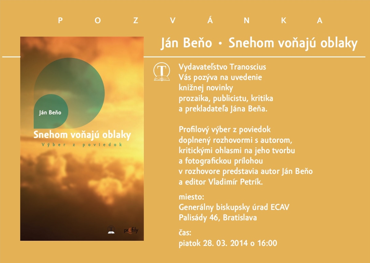 Beňa Snehom voňajú oblaky, ktoré sa bude konať na Generálnom biskupskom úrade ECAV na Slovensku, Palisády 46, v piatok 28. 3. 2014 o 16.00 hod.