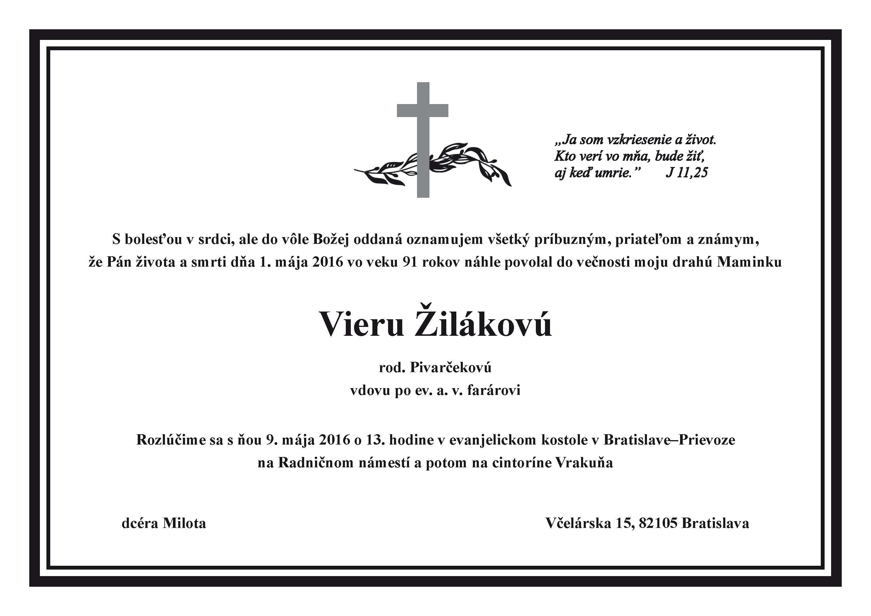 Pán života a smrti si 1. mája 2016 povolal vo veku 91 rokov sestru Vieru Žilákovú, rod. Pivarčekovú, vdovu po ev. farárovi ThDr. Ondrejovi Žilákovi, farárovi vo Zvolenskej Slatine, kde spolu pôsobili v r. 1948 − 1990. Pohrebná rozlúčka bude v Ev. a. v. kostole v Bratislave-Prievoze v pondelok 9. mája 2016 o 13.00 hod. a potom na cintoríne vo Vrakuni.