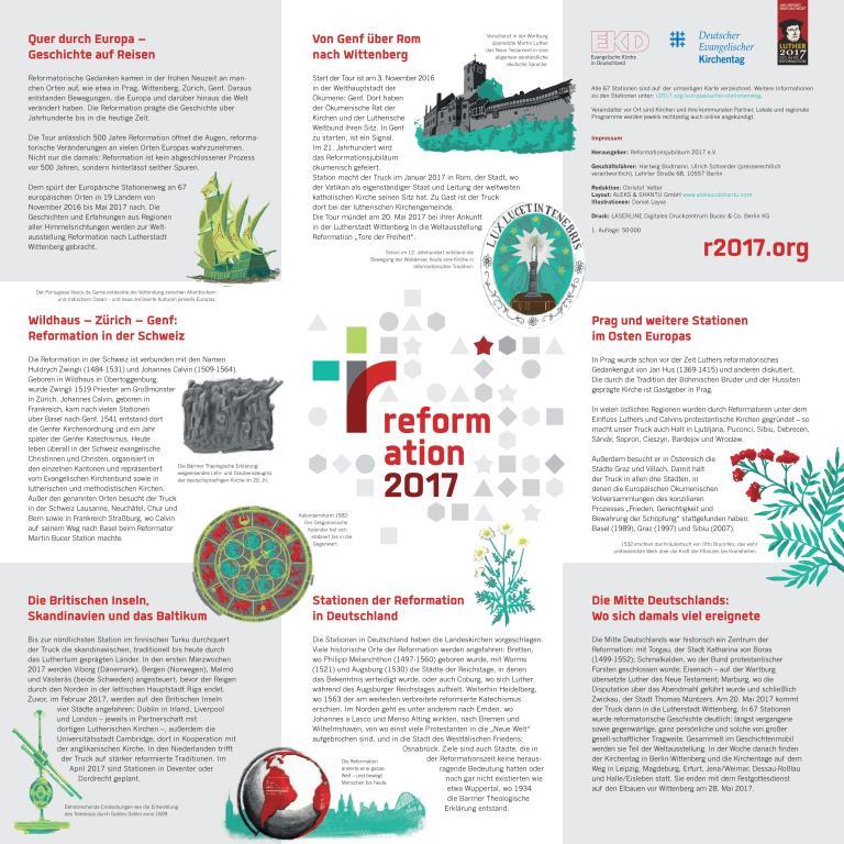 Reformačný kamión chce svojou jazdou spojiť najvýznamnejšie strediská reformácie, ktorá sa začala pred 500 rokmi v Nemecku a vo Švajčiarsku. Preto sa východiskom jazdy stala Ženeva, rodisko kalvínskej reformácie, a cieľom je Wittenberg, rodisko luteránskej reformácie. Okrem týchto dvoch cirkví sa do podujatia zapojila aj cirkev vo Veľkej Británii a Írsku.