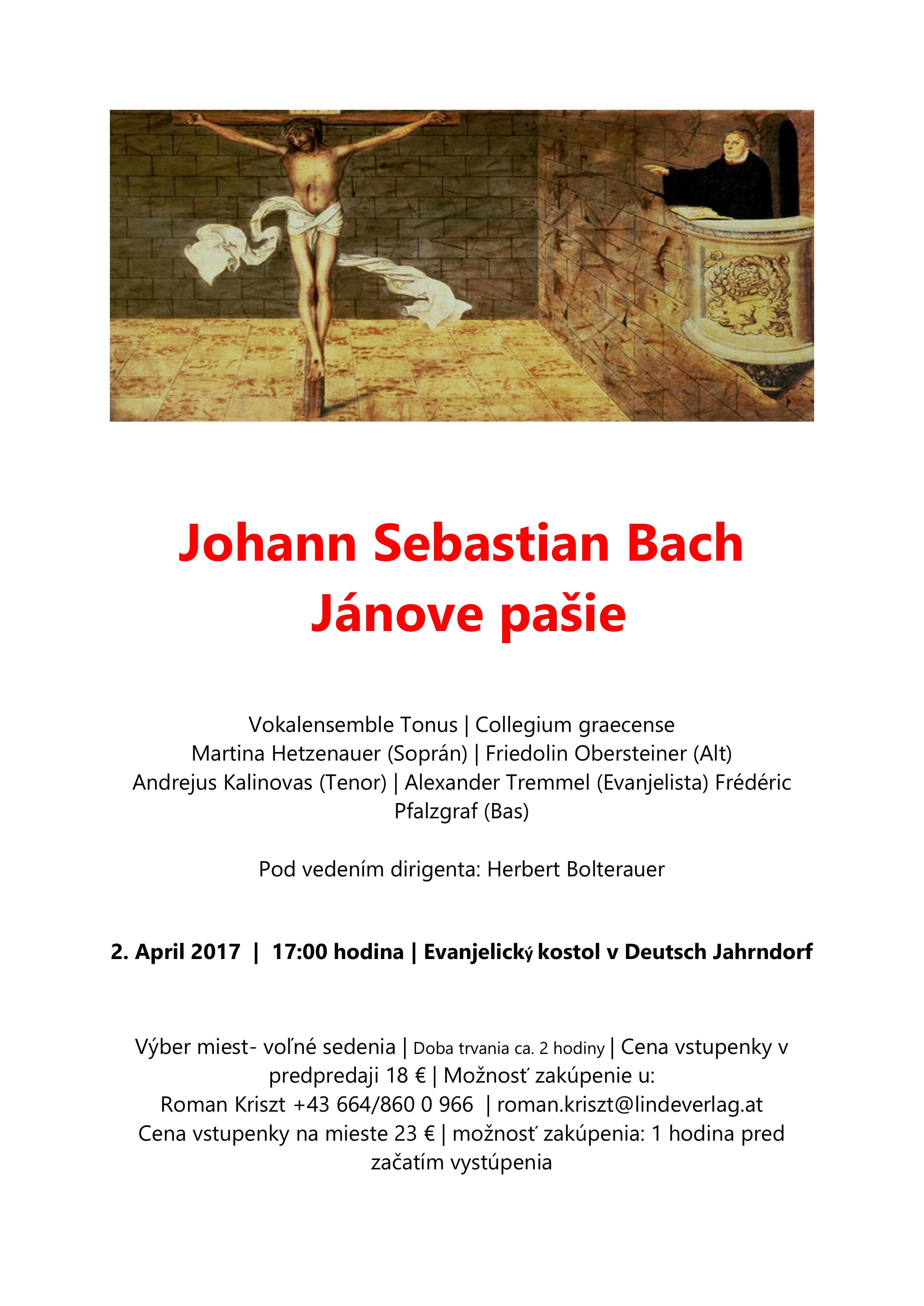 Pozývame Vás do Evanjelického kostola v Deutsch Jahrndorfe v nedeľu 2. apríla 2017 o 17.00 hod. na koncertné uvedenie Jánových pašií od Johanna Sebastiana Bacha. Viac na plagáte.