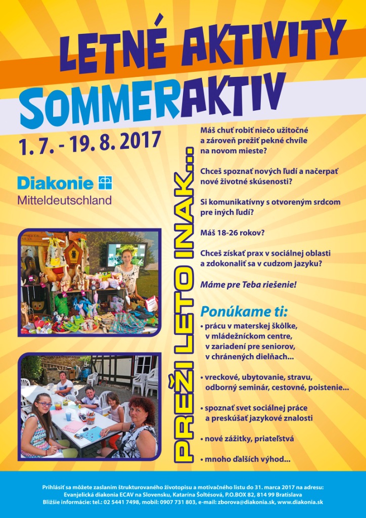 Ústredie Evanjelickej diakonie ECAV na Slovensku opäť pripravuje Letné aktivity formou vzdelávacích a interkultúrnych výmenných pobytov za účelom zdokonalenia jazykových znalostí, spoznania kultúry a sociálnej starostlivosti v Nemecku.