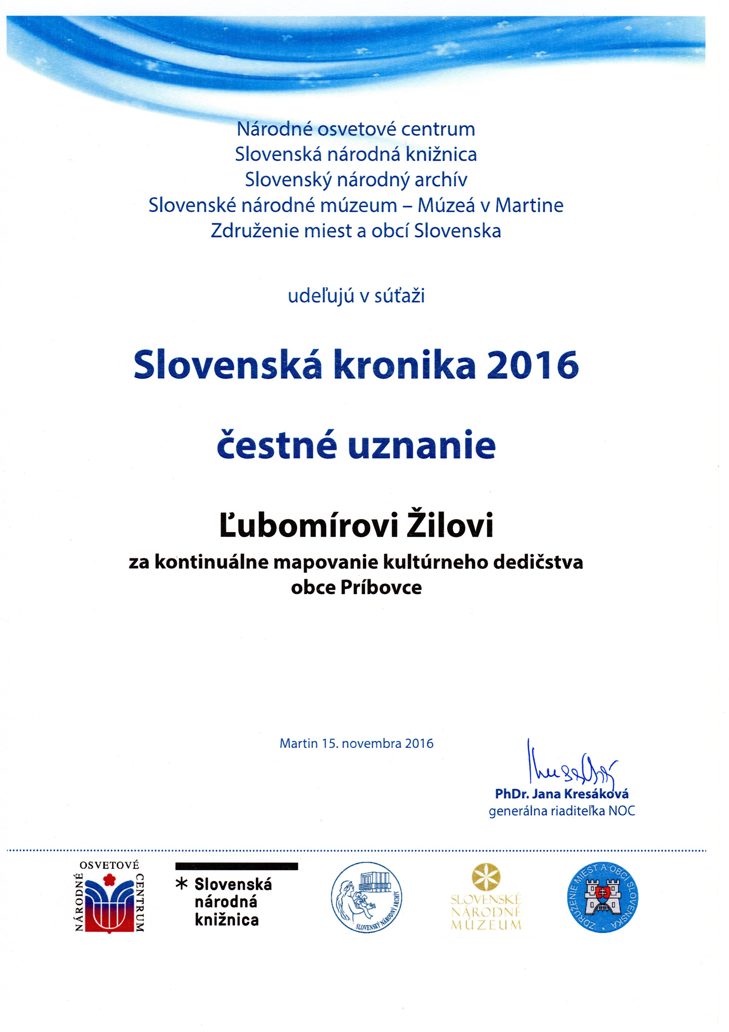 V priestoroch Slovenskej národnej knižnice v Martine sa 15. 11. 2016 zišlo vyše 80 kronikárov, autorov monografií a zástupcov obcí a miest zo všetkých regiónov, ktorí prišli na slávnostné odovzdávanie ocenení už v 9. ročníka celoslovenskej súťaže Slovenská kronika 2016, do ktorej bolo prihlásených 29 kroník a 114 monografii.