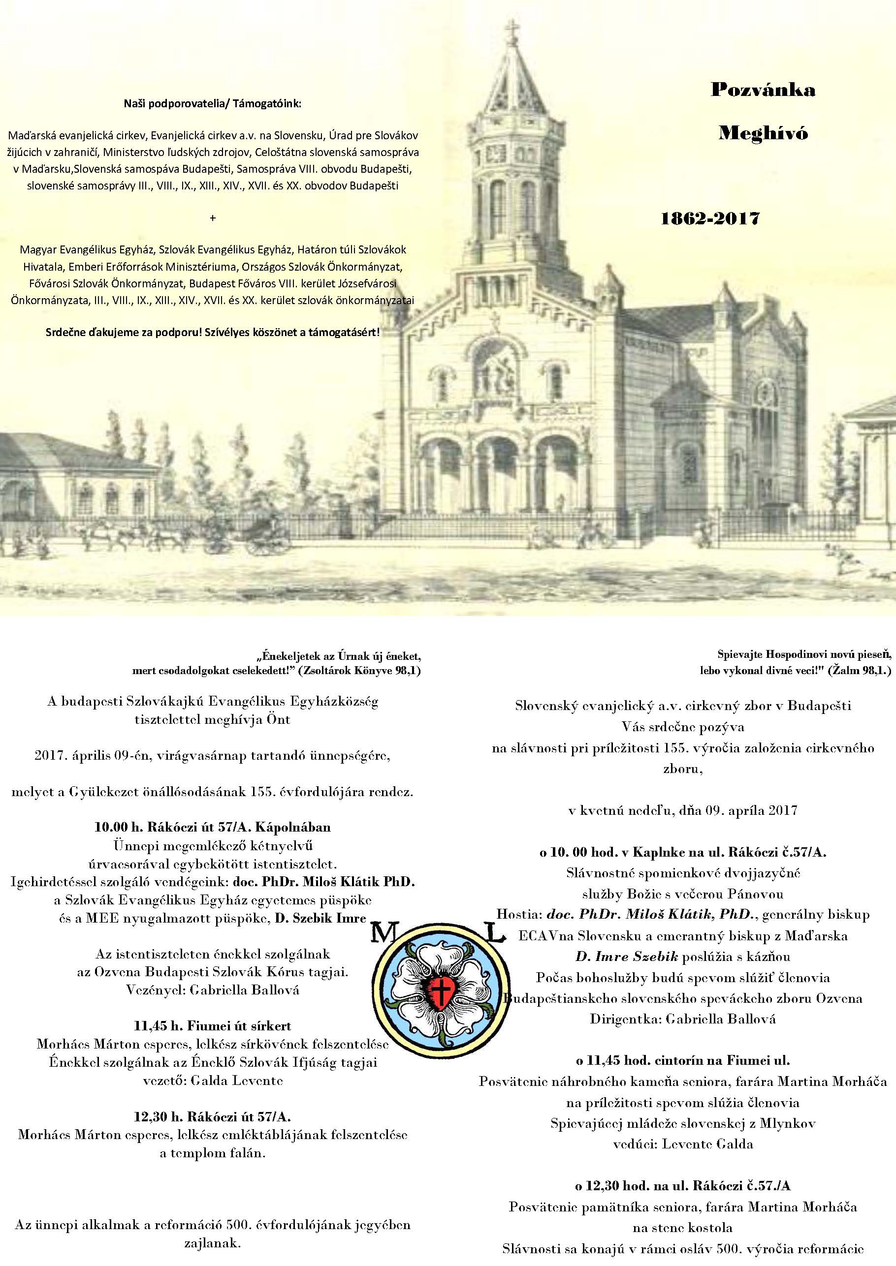 Slovenský ev. a. v. cirkevný zbor v Budapešti pozýva na slávnostné dvojjazyčné služby Božie k 155. výročiu založenia cirkevného zboru, ktoré sa budú konať v modlitebni na Rákócziho 57/A v Budapešti v nedeľu 9. apríla 2017 o 10.00 hod. Kázať bude generálny biskup Miloš Klátik.