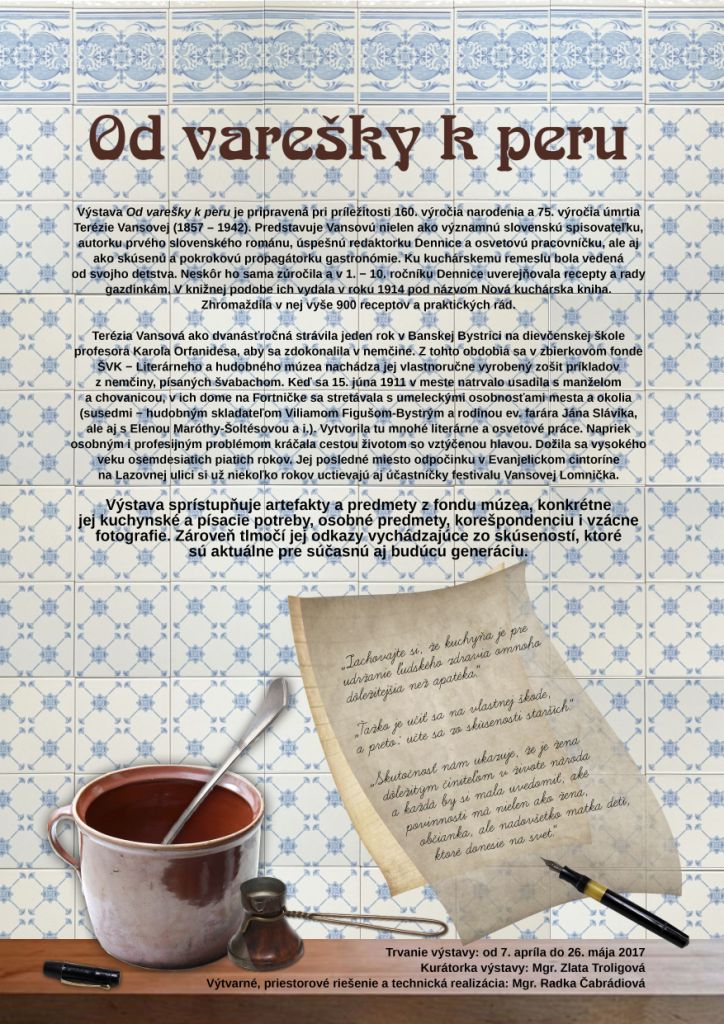 Výstava zo zbierkového fondu múzea predstavuje Vansovú nielen ako významnú slovenskú spisovateľku, autorku prvého slovenského románu Sirota Podhradských, úspešnú redaktorku Dennice a osvetovú pracovníčku, ale aj ako skúsenú a pokrokovú propagátorku gastronómie. Ku kuchárskemu remeslu bola vedená od svojho detstva. Neskôr ho sama zúročila a v 1. − 10. ročníku Dennice uverejňovala recepty a rady gazdinkám. V knižnej podobe ich vydala v roku 1914 pod názvom Nová kuchárska kniha. Zhromaždila v nej vyše 900 receptov a praktických rád. Kniha mala veľký ohlas u čitateľov a bola publikovaná vo viacerých vydaniach (1914, 1925, 1930, v roku 1998 pod názvom Recepty prastarej matere).