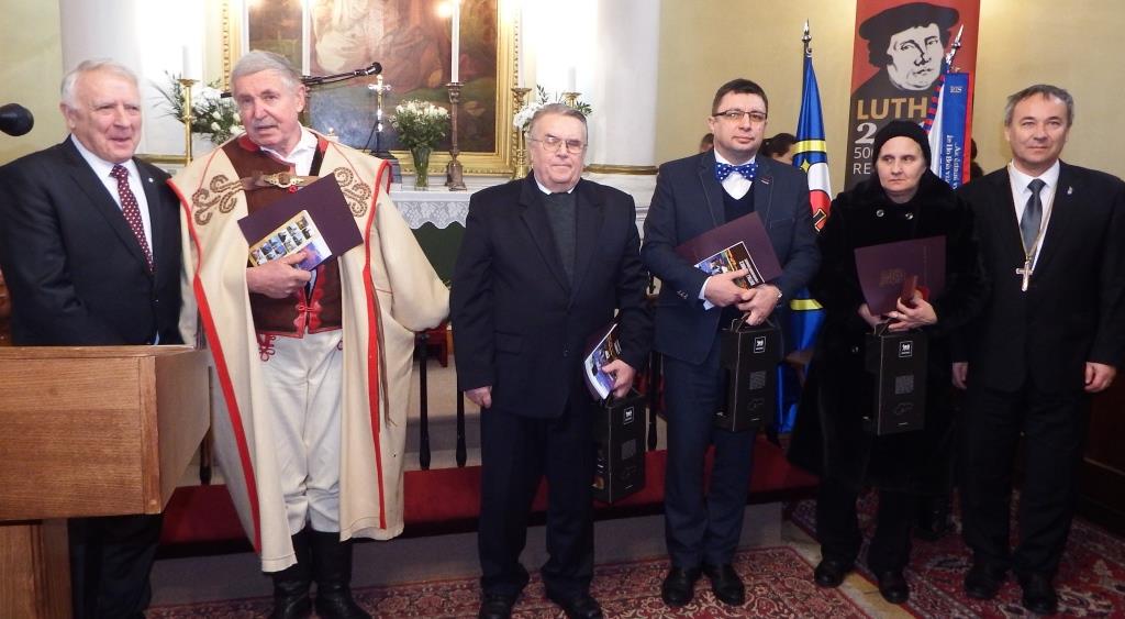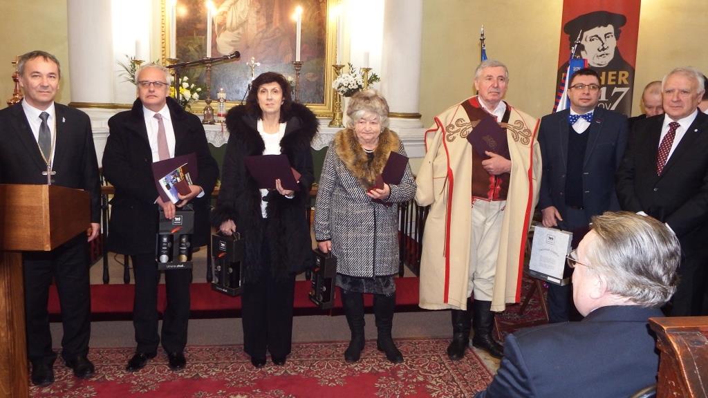 V ďalšej časti programu Predsedníctvo ECAV na Slovensku slávnostne odovzdalo pamätné medaily ECAV a pamätné listy k 500. výročiu reformácie významným osobnostiam Novohradského seniorátu. Generálny biskup Miloš Klátik a generálny dozorca Imrich Lukáč najskôr odovzdali ocenenia predstaviteľom miestnej samosprávy, a to primátorke mesta Lučenec PhDr. Alexandre Pivkovej, primátorovi mesta Veľký Krtíš Ing. Daliborovi Surkošovi a primátorovi mesta Poltár Pavlovi Gavalcovi. Za ocenených poďakovala pani primátorka Pivková.