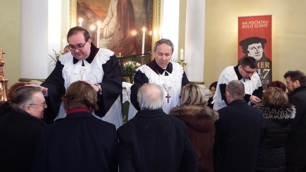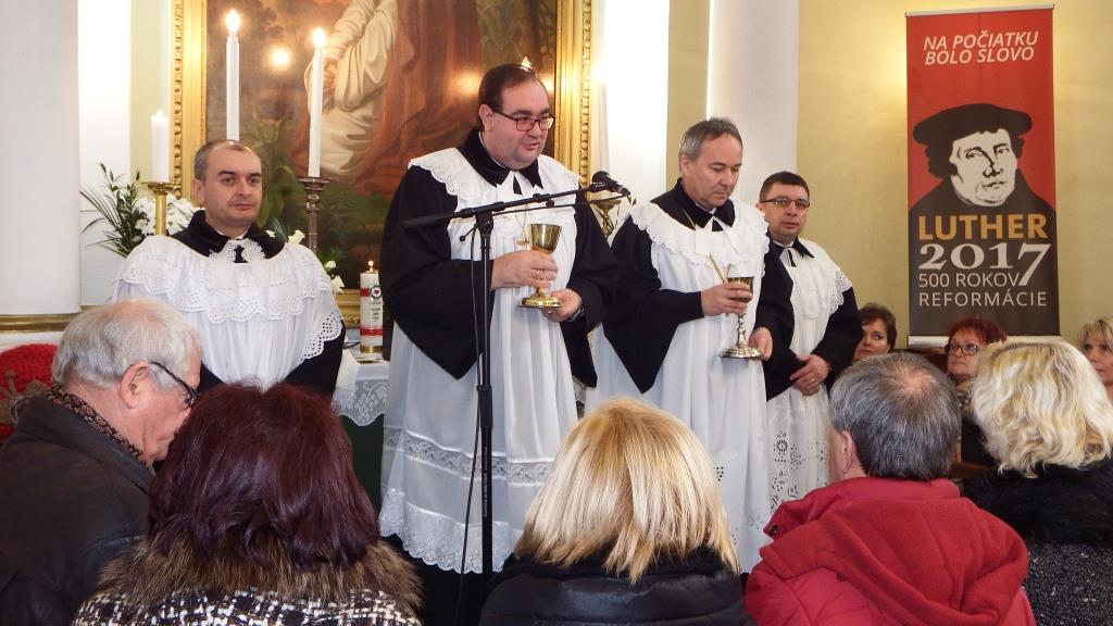 Úvodnú liturgiu mali konsenior NOS Jaroslav Ďuriš a domáci farári Ľudovít Hroboň a Mária Hroboňová. Kázňou slova Božieho poslúžil dištriktuálny biskup Milan Krivda, nakoľko pozvaný hosť zo Slovenskej evanjelickej a. v. cirkvi v Srbsku biskup Samuel Vrbovský nemohol pricestovať pre náhle ochorenie. Brat biskup Krivda kázal na základe biblického verša určeného pre Novohradský seniorát: „A tak ospravedlnení z viery máme pokoj s Bohom skrze svojho Pána Ježiša Krista.“ (R 5, 1) Na záver kázne povedal: „Pokoj s Bohom môžeme mať jedine skrze Ježiša Krista, keď prijmeme Jeho dielo záchrany vierou a odovzdáme sa Mu celým svojím životom. Pán Boh nás nikdy nás neopustí. Bratia a sestry, vzdávajme aj my Bohu chválu za to, že už pred 500 rokmi túto pravdu priniesol znovu na svetlo Božie náš reformátor Dr. Martin Luther, ale aj iní mužovia reformácie a my až dodnes môžeme podľa toho nielen veriť, ale aj svoju vieru žiť.“Pred Večerou Pánovou veriacich oslovil senior NOS Ivan Mucha na základe verša z M 7, 15: „Nič nevchádza zvonku do človeka, čo by ho mohlo poškvrniť, ale čo z človeka vychádza, to poškvrňuje človeka.“ V príhovore zdôraznil: „Zlo nepochádza z vonkajších okolností, ale zo spôsobu, ako na ne reagujeme. ... Napredovať budeme len vtedy, keď sa naplno oddáme dobru, ktorého sme schopní a ku ktorému sme boli aj povolaní.“