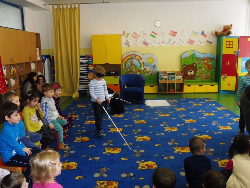 Z tejto milej návštevy sme sa všetci veľmi tešili. Pán Juraj nám ukázal niektoré pomôcky, ktoré mu pomáhajú pri bežných denných činnostiach. Mohli sme si tak uvedomiť, že veci, ktoré sú pre nás vidiacich úplne samozrejmé, nie sú bežné a samozrejmé pre ľudí, ktorí nevidia. Deti si mohli otestovať napríklad prístroj, ktorý rozlišuje farby na oblečení, alebo prístroj, ktorý pomáha pri nalievaní vody do pohára. Obrovskú radosť mali zo psíka Lukyho, ktorý na slovo poslúchal svojho pána. Pán Juraj deťom vysvetlil, že keď má psík na sebe popruhy, vie, že je „v práci“, a nikto ho nesmie vyrušovať, aby vedel naplno pomáhať a slúžiť svojmu pánovi. Keď mu však dal popruhy dolu, deti ho mohli aj pohladkať a odfotiť sa s ním.