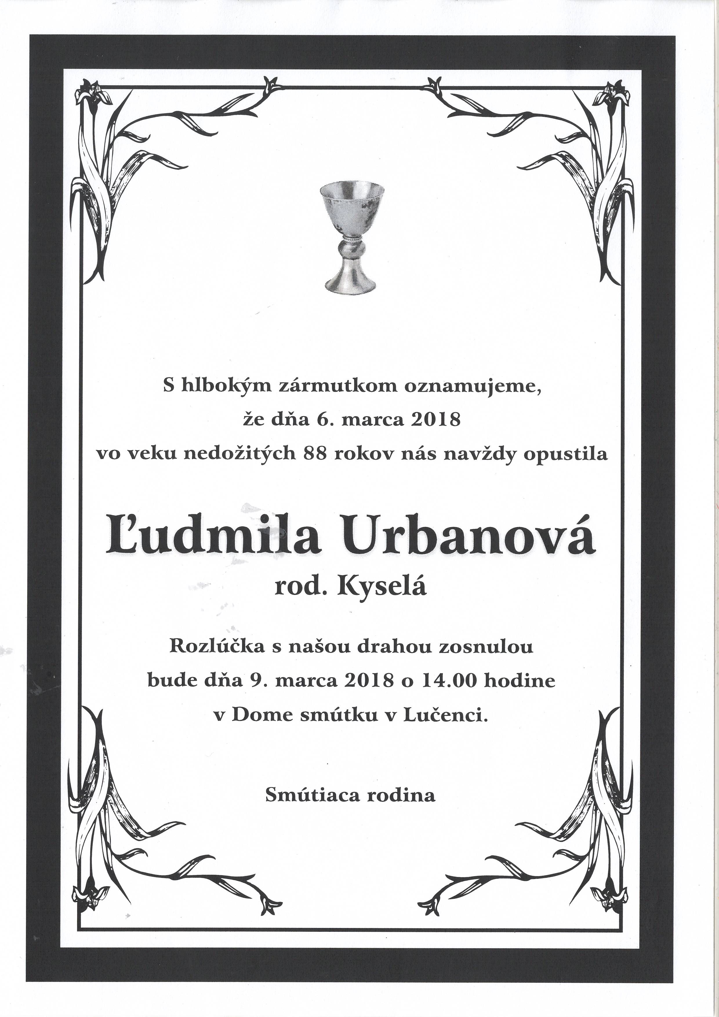 oznamujeme Vám, že Pán Boh si k sebe povolal sestru Ľudmilu Urbanovú, vdovu po bratovi farárovi Ondrejovi Urbanovi. Pohrebná rozlúčka sa bude konať v piatok 9. marca 2018 o 14.00 hod. v Dome smútku v Lučenci.