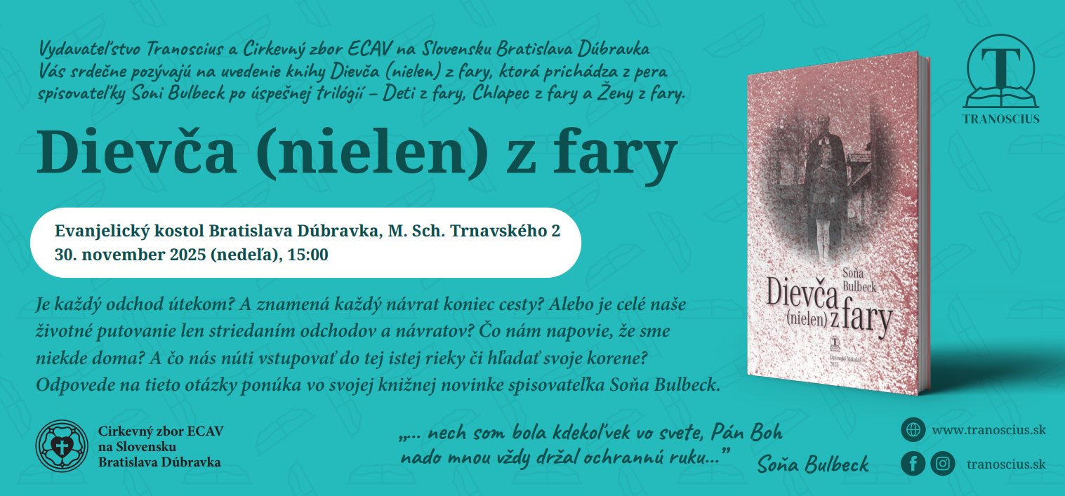 Srdečne Vás pozývame na uvedenie novej knihy spisovateľky Soni Bulbeck s názvom: Dievča (nielen) z fary, ktorá prichádza po úspešnej trilógii Deti z fary, Chlapec z fary a Ženy z fary.