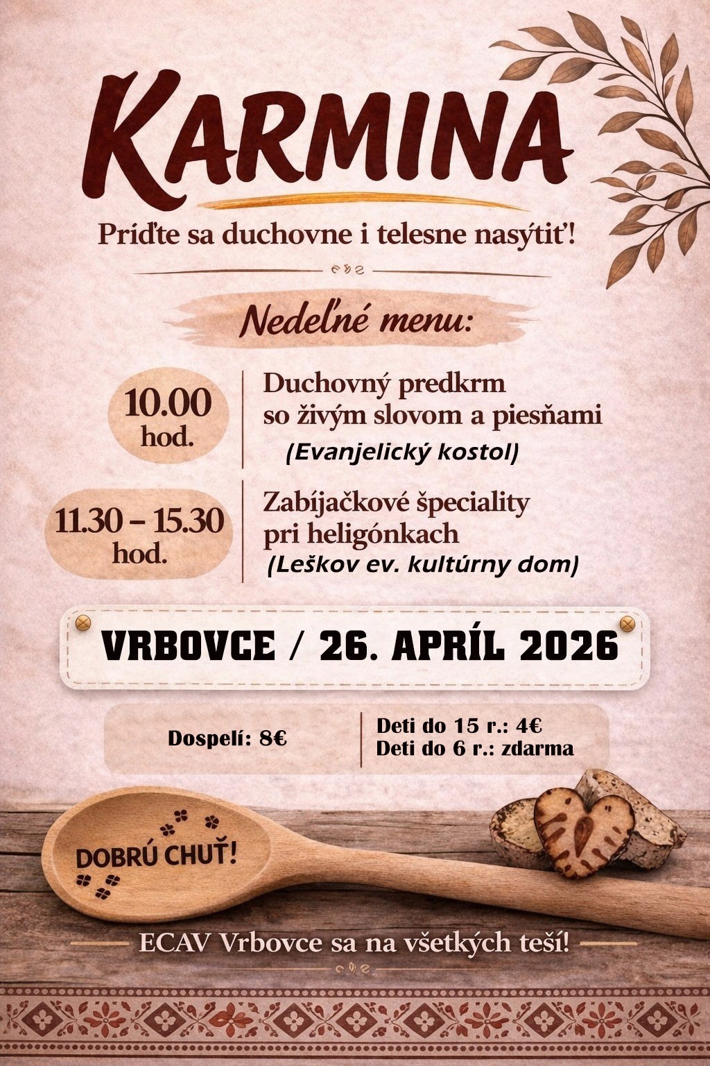 Evanjelický cirkevný zbor vo Vrbovciach Ťa srdečne pozýva na bohatú zabíjačkovú hostinu – KARMINU v Leškovom kultúrnom dome vo Vrbovciach, ktorú si bude môcť užiť každý z nás v 3. nedeľu po Veľkej Noci, dňa 26. apríla 2026 už od 10.00 hodiny.