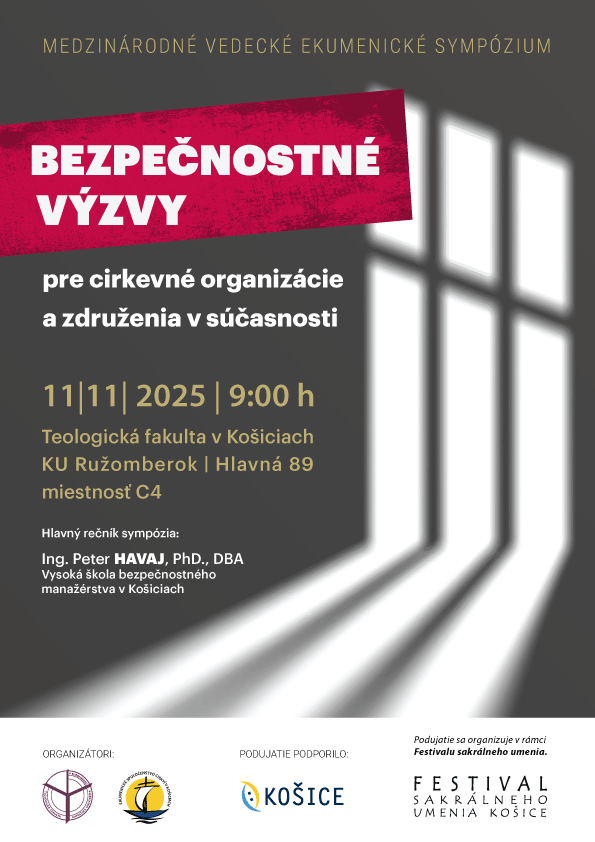 Ekumenické spoločenstvo cirkvi a náboženských spoločností v Košiciach v rámci Festivalu sakrálneho umenia v Košiciach, pripravuje Medzinárodné vedecké ekumenické sympózium BEZPEČNOSTNÉ VÝZVY PRE CIRKEVNÉ ORGANIZÁCIE A ZDRUŽENIA V SÚČASTNOSTI, v spolupráci s TF v Košiciach KU Ružomberok a Mestom Košice.