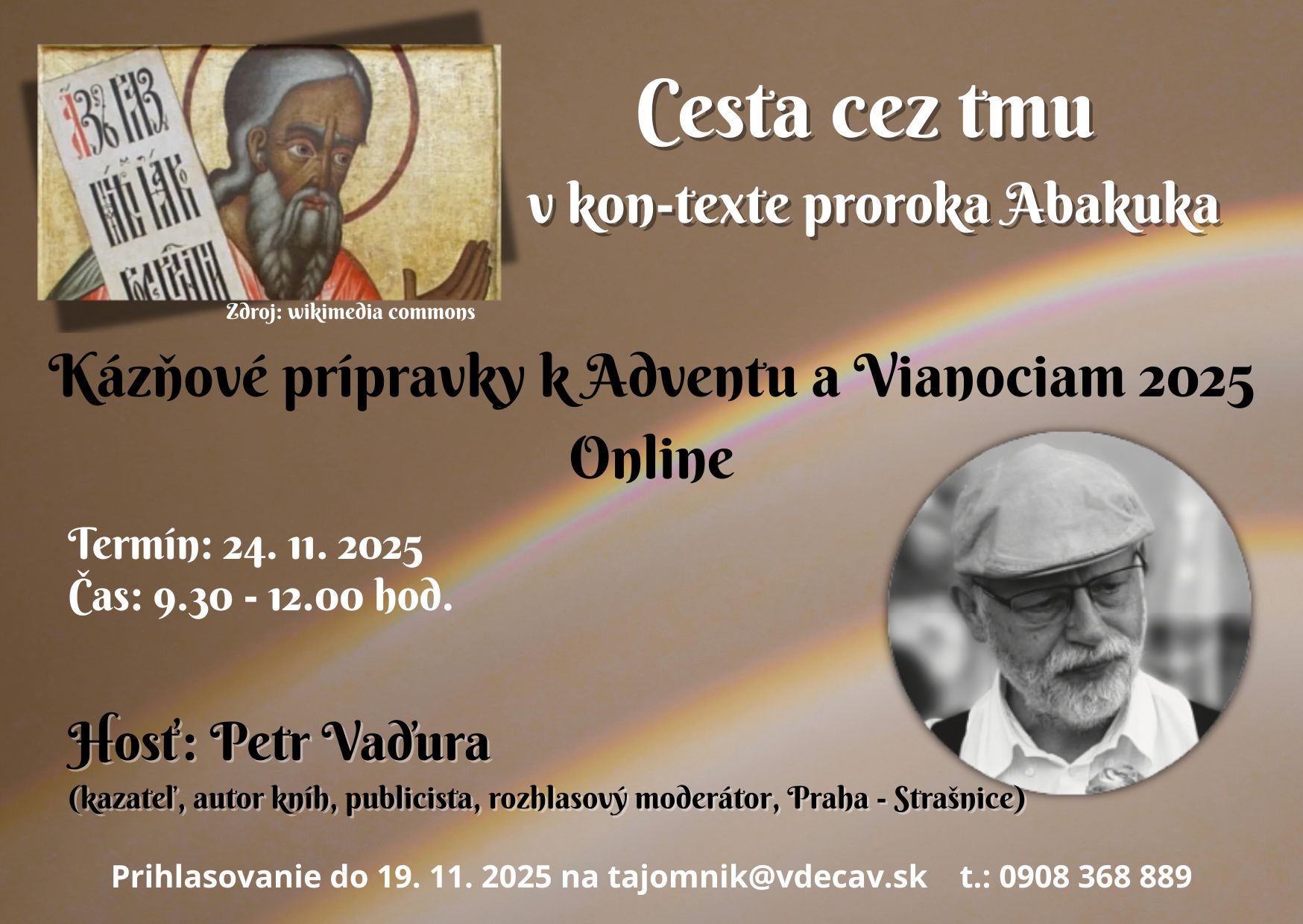 Na tému „Cesta viery cez tmu (v kon-texte proroka Abakuka)“ bude prednášať hosť z Českej republiky Mgr. Petr Vaďura.