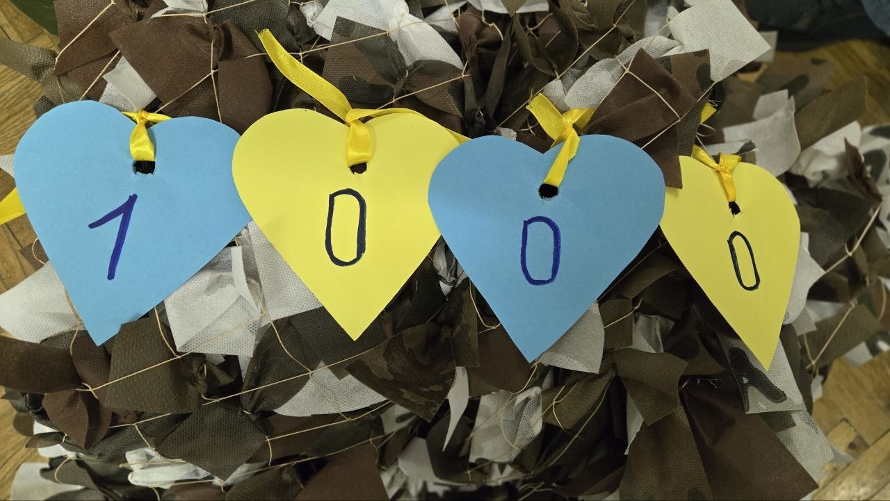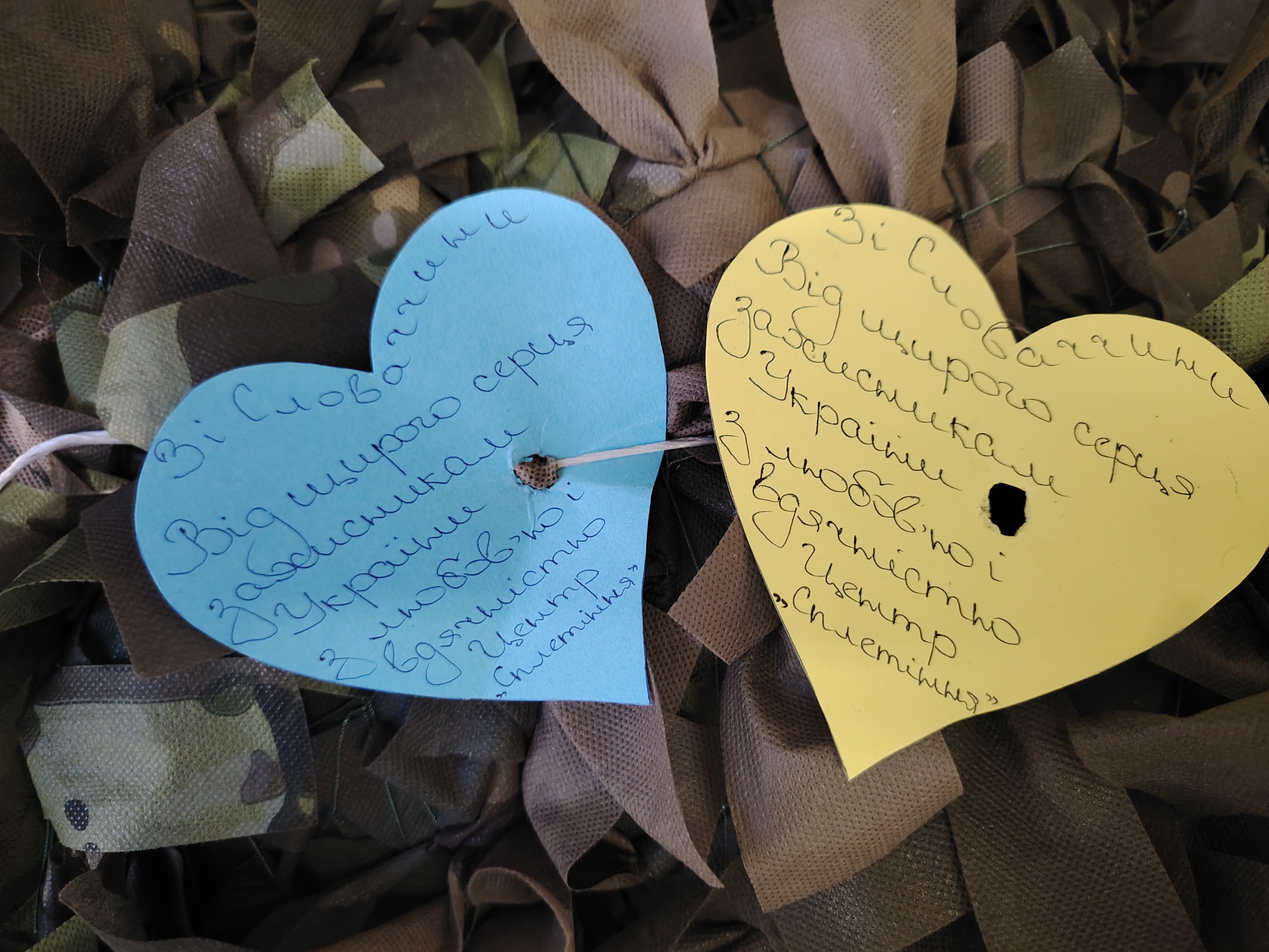 "V Košiciach neustále pletieme ochranné siete. Hotové, zbalené siete dostávajú farebné srdce, na ktorom je napísané: "Zo Slovenska. Zo širokého srdca obrancom Ukrajiny s láskou a vďačnosťou, centrum Spletinia."
