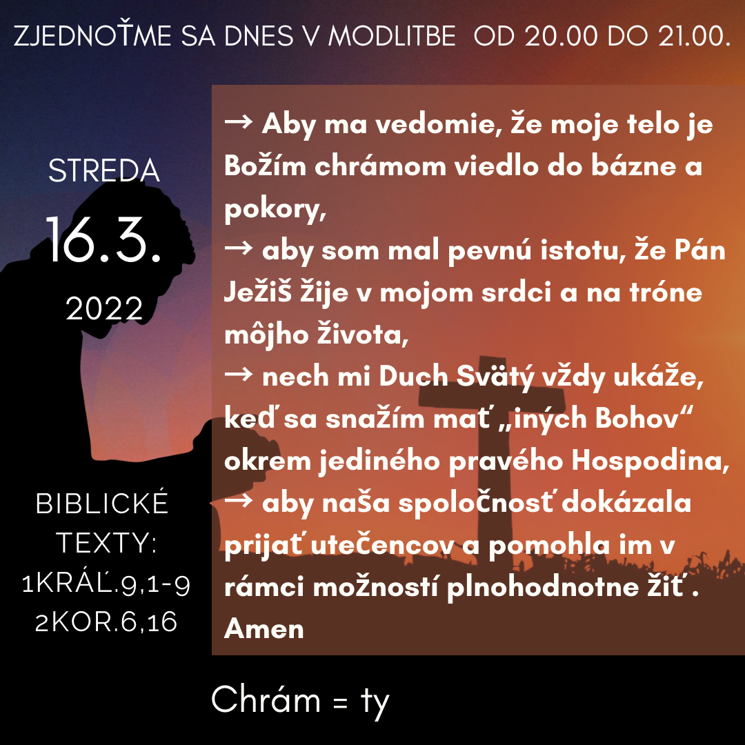 Verím, že s pokorou ale aj s istotou môžeme vyhlásiť: „My sme predsa chrám živého Boha, ako hovorí Boh: Budem v nich prebývať a medzi nimi prechádzať sa, a budem ich Bohom a oni budú mojím ľudom.“ 2.Kor 6, 16