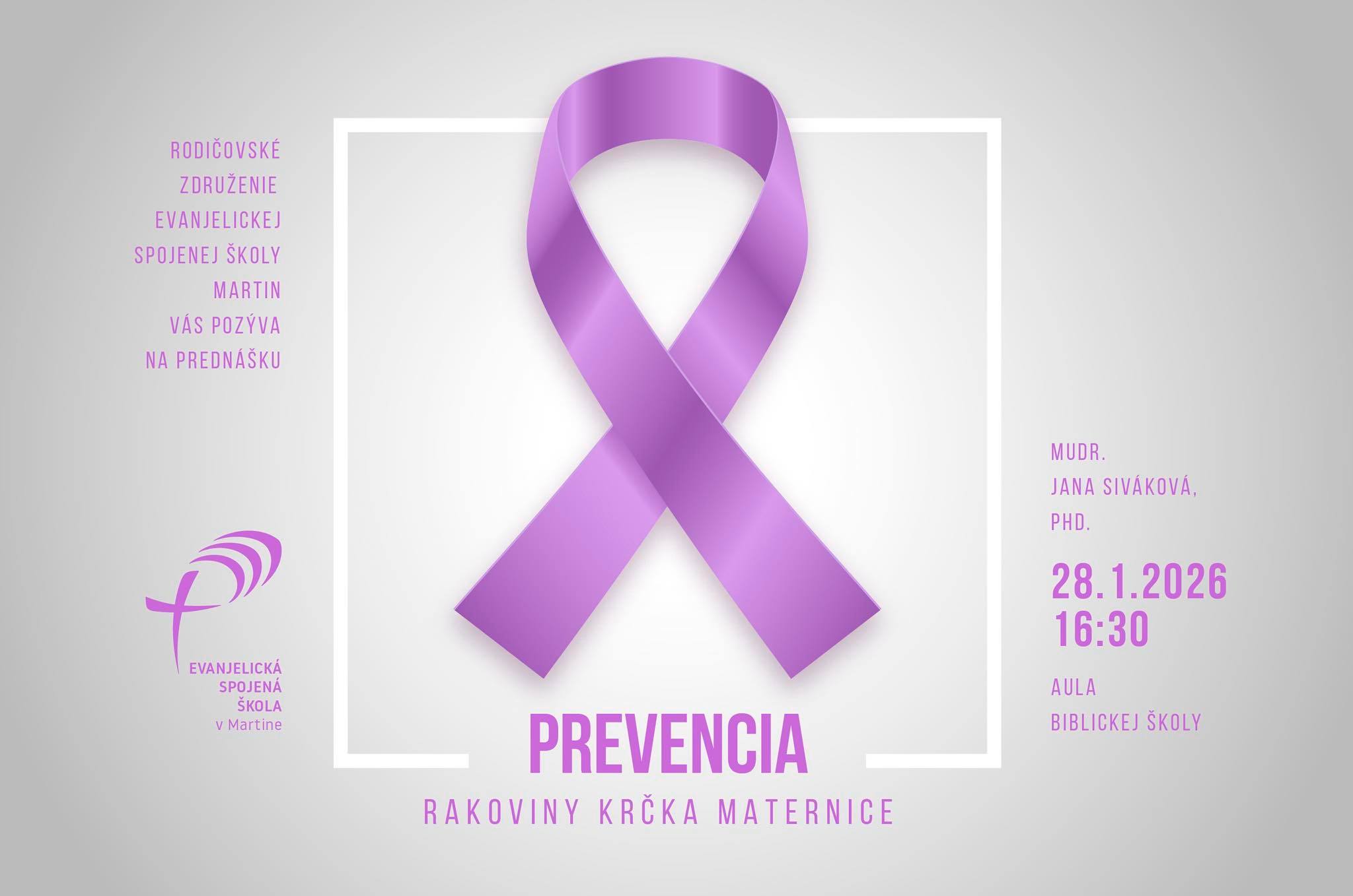 Rodičovské združenie Vás pri príležitosti januára-mesiaca povedomia o rakovine krčka maternice pozýva na prednášku venovanú téme prevencie tohto ochorenia s MUDr. Janou Sivákovou. Vidíme sa budúcu stredu o 16:30 v aule Biblickej školy.