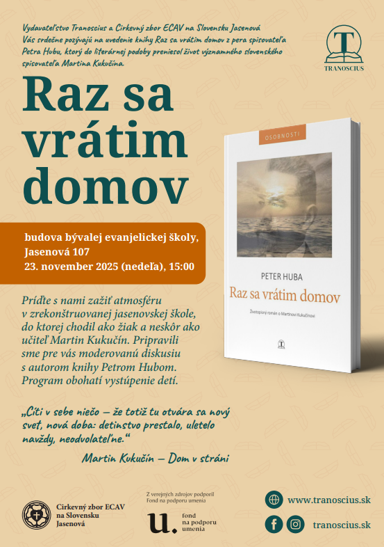 Srdečne vás pozývame na uvedenie knihy Raz sa vrátim domov o spisovateľovi Martinovi Kukučínovi od Petra Hubu. Stretneme sa v nedeľu 23. novembra 2025 o 15.00 v budove bývalej evanjelickej školy v Jasenovej – mieste, kde Matej Bencúr (Martin Kukučín) ako žiak študoval a neskôr učil. Podujatie prebehne formou moderovanej diskusie s autorom, obohatí ho aj vystúpenie detí.