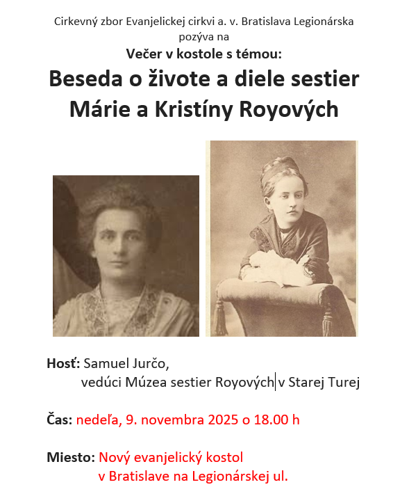 Srdečne vás pozývame na Večer v kostole – besedu o živote a diele sestier Márie a Kristíny Royových so Samuelom Jurčom – vedúcim Múzea sestier Royových v Starej Turej. Podujatie sa uskutoční v nedeľu, 9. novembra o 18.00 h v Novom kostole. Bude na ňom aj možnosť zakúpiť si knihy sestier Royových.